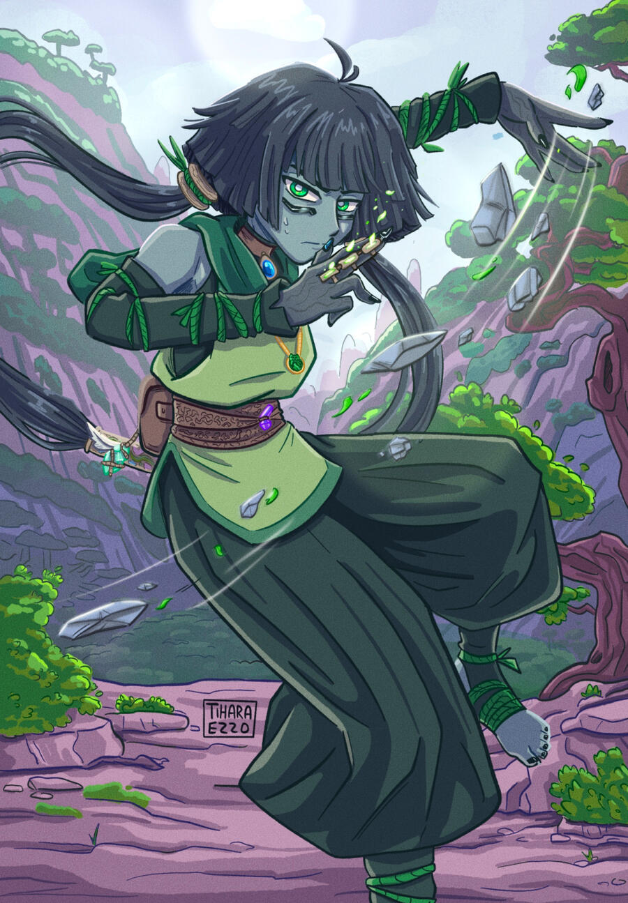 Meet Jet, the earth genasi druid. She is named (and inspired) after the gemstone, which is on her face and nails. Jet is an organic mineral, like charcoal, and is formed when woody materials are buried. So she gets stone from her genasi side and plants from her druid elven side.Jet grew up in an elven village hidden in the mountains. Her genasi father seldom visited, but when he did, he brought small gifts for his daughter in the form of various gems. These gems represented her mysterious genasi heritage and the magic that lies beneath the surface of this world. When she came of age, she decided to leave her comfy life and seek out new gems and magic.